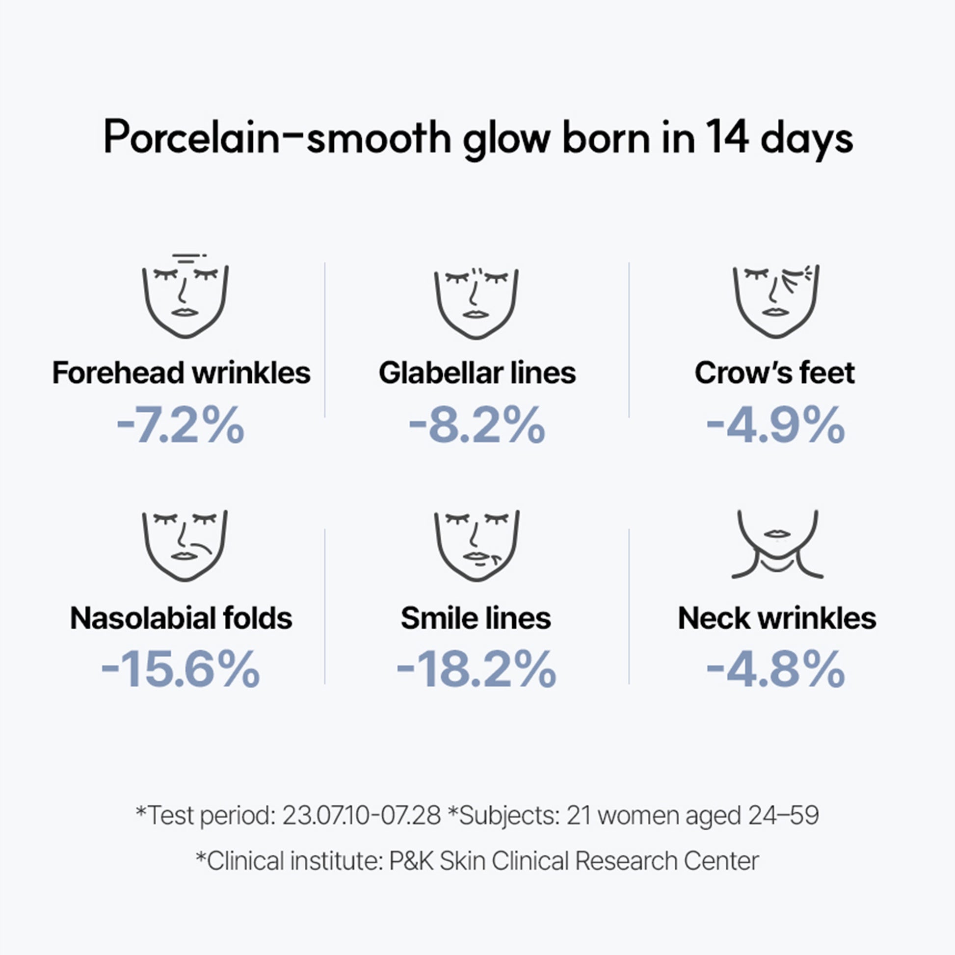 Targets top wrinkle areas—forehead, glabella, smile lines, crow’s feet—improving skin texture in 14 days. -