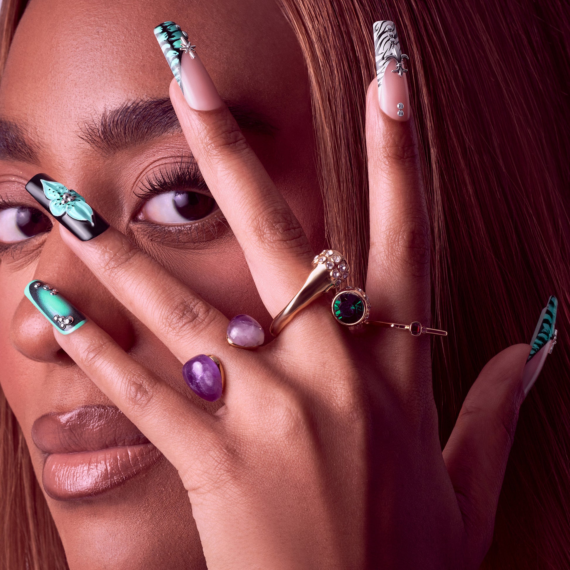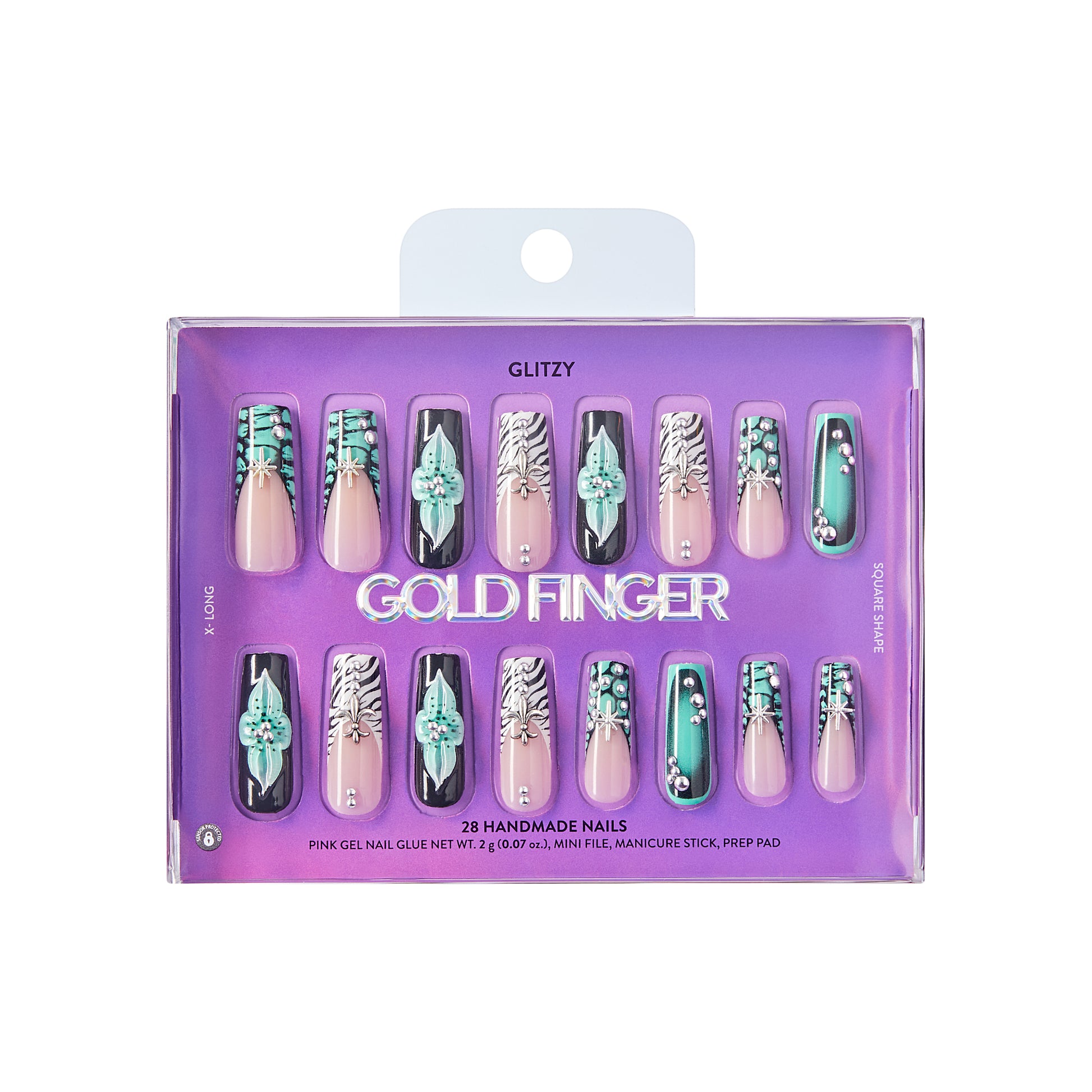 Make a bold statement with the Goldfinger Glitzy Collection. This exclusive design blends edgy wild prints with elegant floral sculpting. Featuring intricate black zebra patterns contrasting with hand-sculpted 3D teal flowers and silver stud accents, this set delivers a high-end, custom salon look without the price tag.