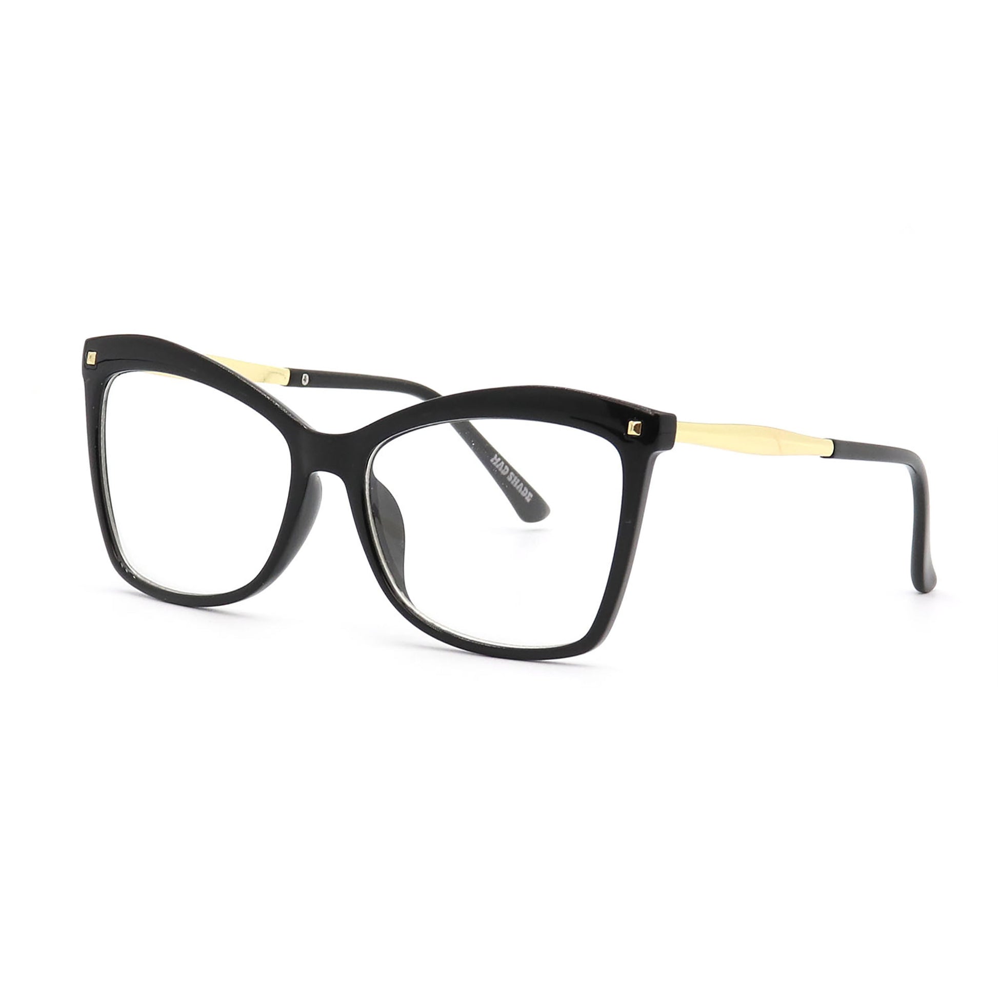 Elevate your everyday style with a touch of elegance in the Mad Shade Black Cat Eye Glasses. Featuring a classic black silhouette beautifully contrasted with sleek gold temple accents, these retro-inspired fake glasses deliver a sophisticated and chic attitude. The non-prescription clear lenses make them the perfect fashion-forward accessory for office outfits, casual streetwear, or elevating a no-makeup look. Crafted with a premium mix of copper and lightweight materials, they offer a comfortable and durable fit that flatters any face shape.