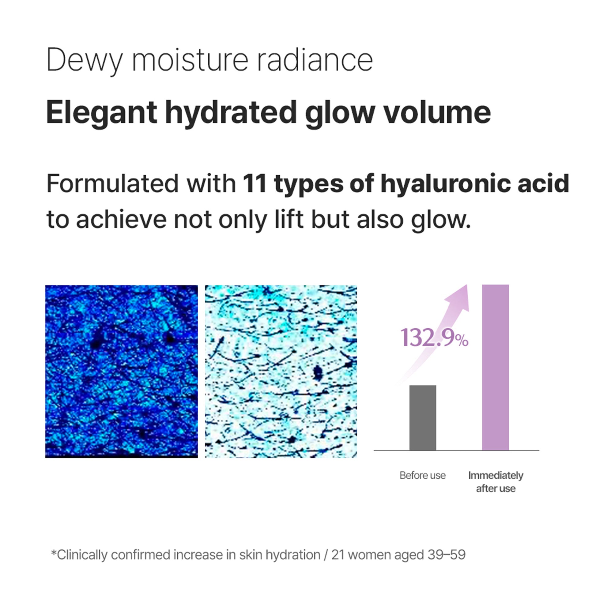 11 types of hyaluronic acid give long-lasting moisture and a fresh, dewy finish. -